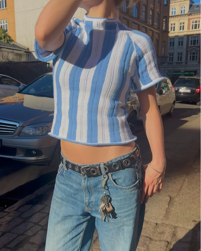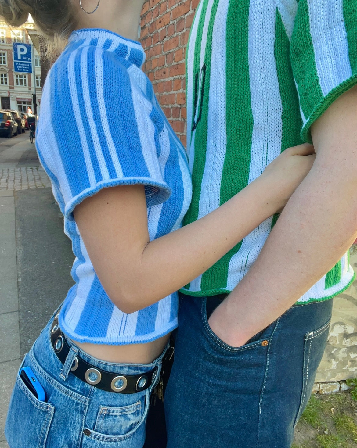 The Football Jersey 2.0 er en strikket raglan-t-shirt, hvor sporty striber og skarpe kanter skaber et fodboldinspireret look. Perfekt til den fodboldglade strikker – eller til en heldig fodboldfan i dit liv. Halsudskæringen formes af German Shortrows som giver en hævet nakke og dybere halsudskæring. (FLERE FOTOS AF VERSION 2.0 PÅ VEJ)